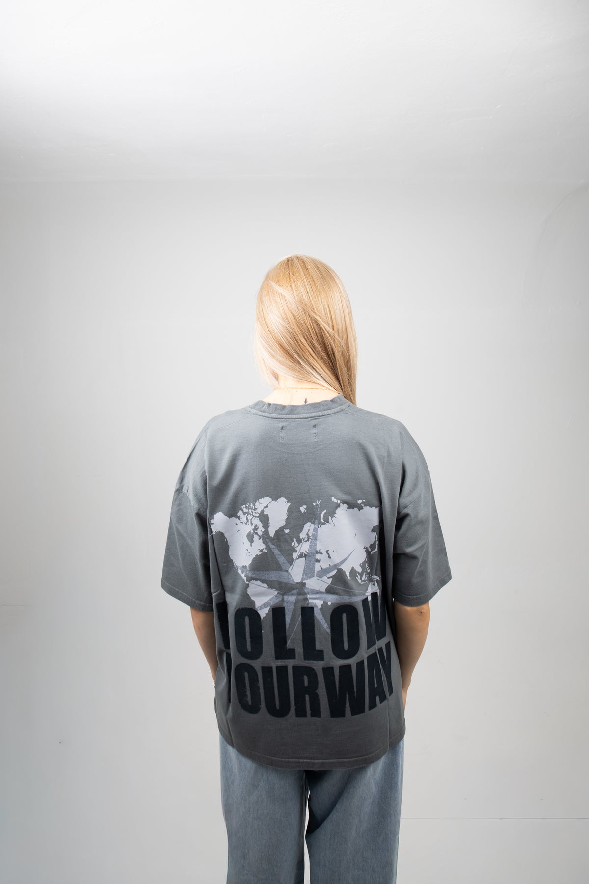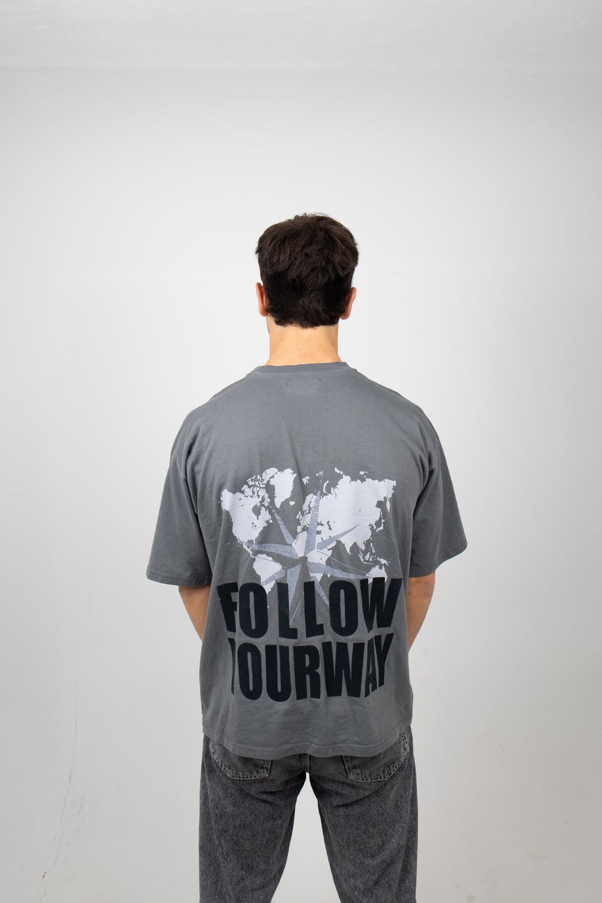La MAPLINE es un viaje en forma de camiseta. En color gris oscuro y con corte oversize, presenta en el pecho el logo discreto en el lateral izquierdo. La parte trasera se convierte en protagonista con un diseño de mapa, brújula y la frase “¡Sigue tu camino!” en negro, transmitiendo fuerza y decisión. Una prenda pensada para quienes buscan avanzar sin perder su estilo.